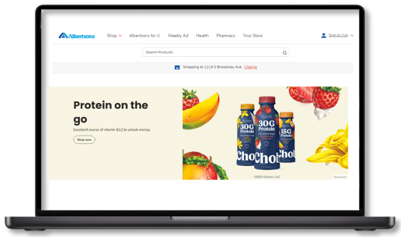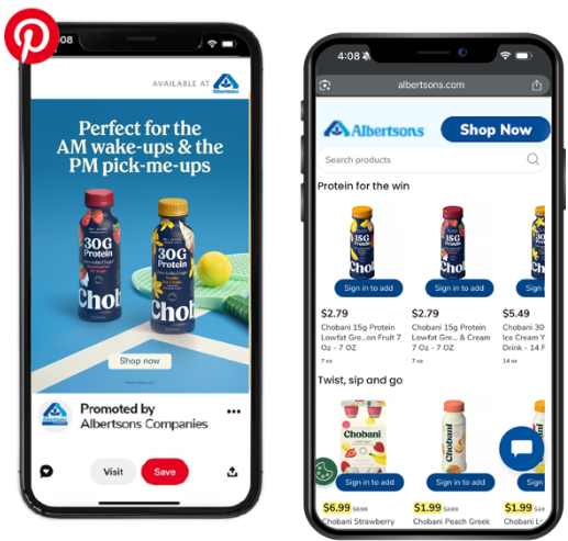Chobani layered a broad awareness video strategy early in their omni-channel campaign to establish a path to conversion, activating additional tactics mid-campaign to drive performance. Dynamic placements across connected television, static and carousels on Pinterest, offsite video, and strategic onsite placements paired with Albertsons' first-party shoppers, brand buyers, and category buyers, created a campaign that delivered energy and excitement plus seamless add-to-cart functionality.
